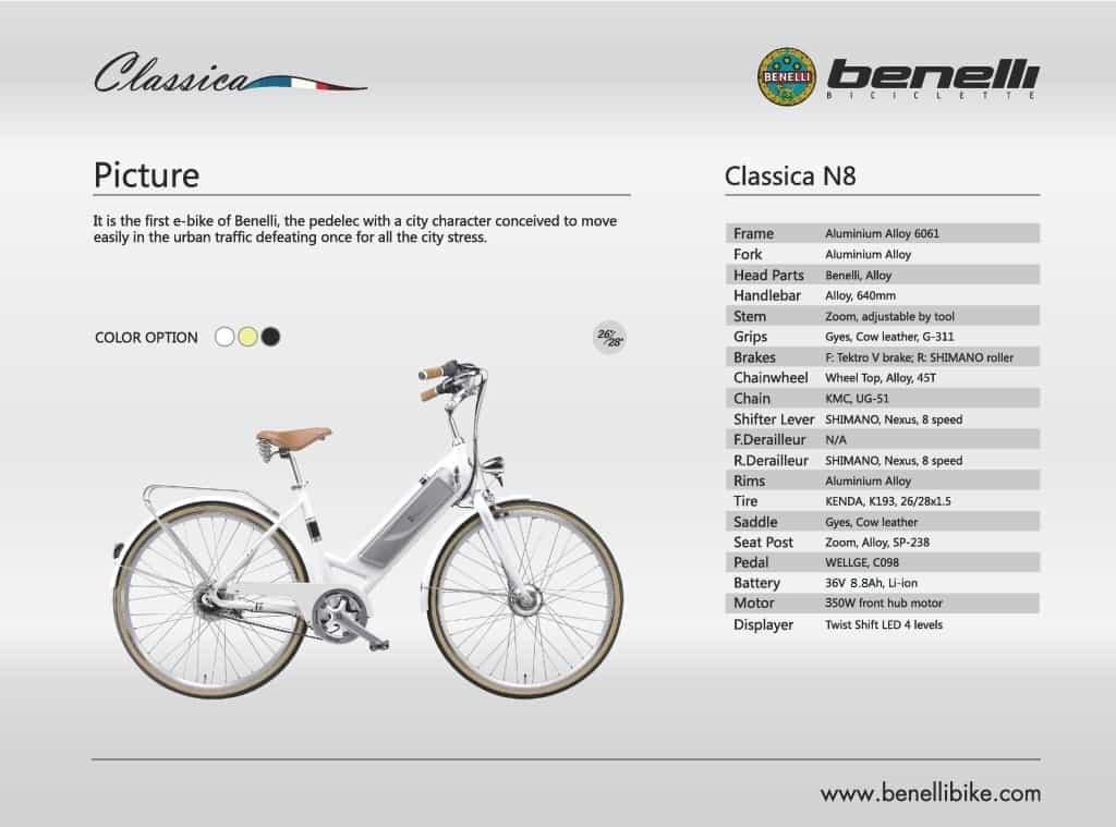 The Benelli ‘green revolution’ is getting started. Conceived for the urban streets, the Classica has a range of seventy kilometres. The Benelli e-bike has a sturdy aluminium frame sustained on 71 cm (28 in.) alloy wheels that ensure reliability and comfort under any conditions. The lithium battery (36V, 10.4Ah) is very light, rechargeable in 4 to 6 hours and located in the front frame leaving free the section of the carrier.